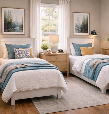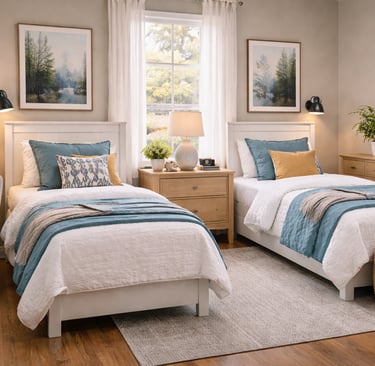 Our shared bedrooms provide a comfortable and peaceful living space designed for rest and privacy. Each room includes twin beds, cozy bedding, and thoughtfully arranged furnishings that create a calm environment where residents can relax and feel at home.